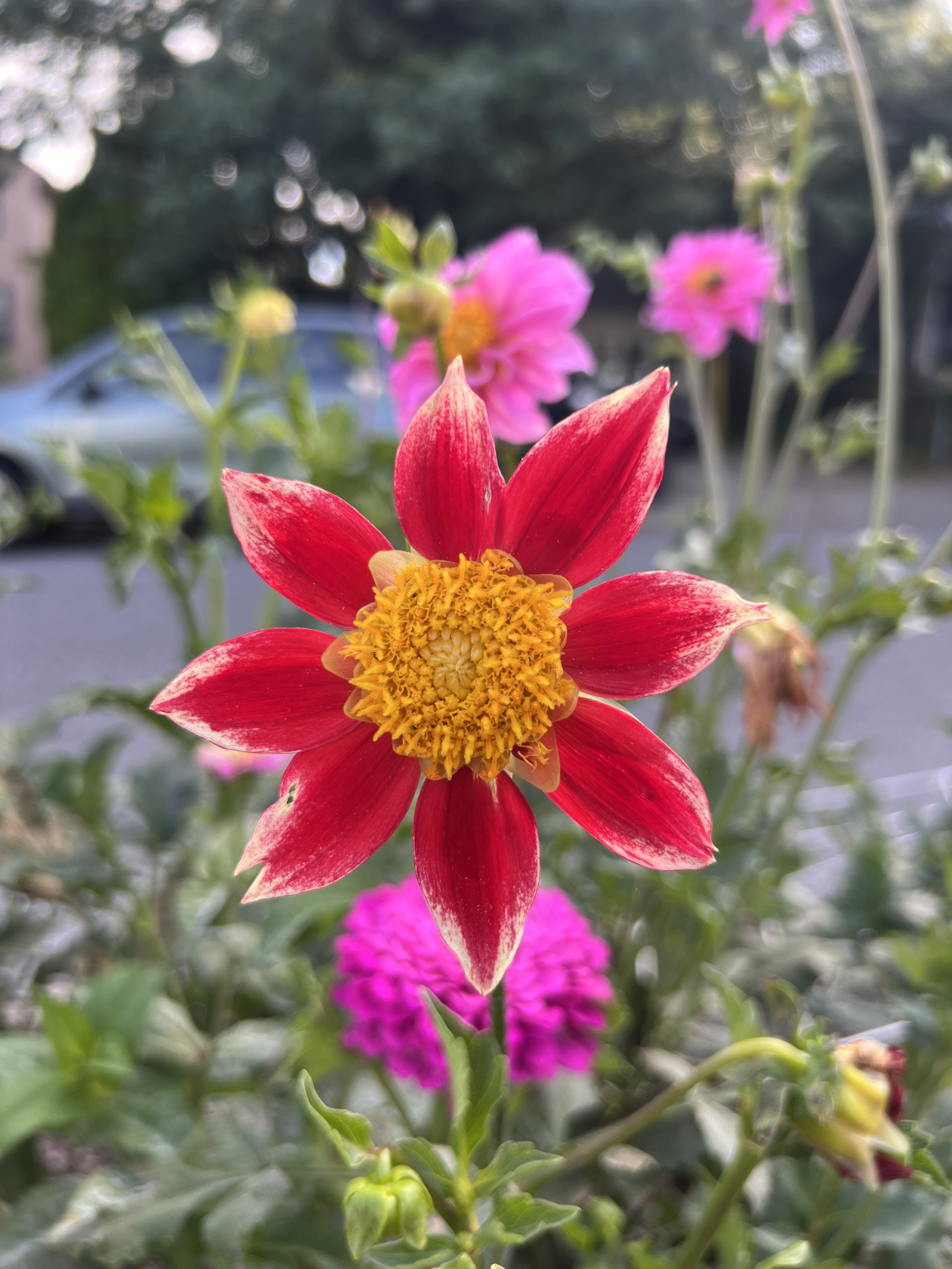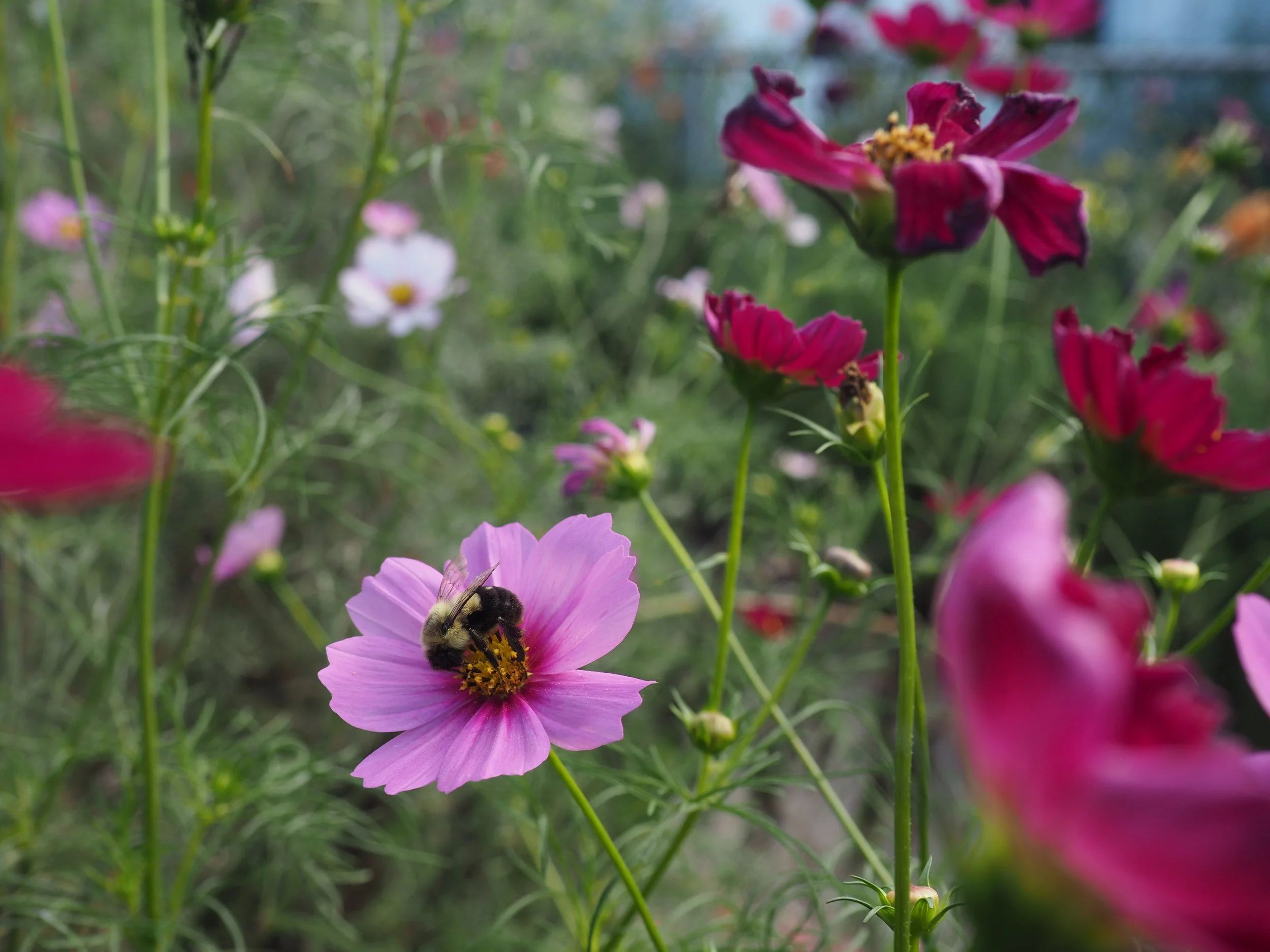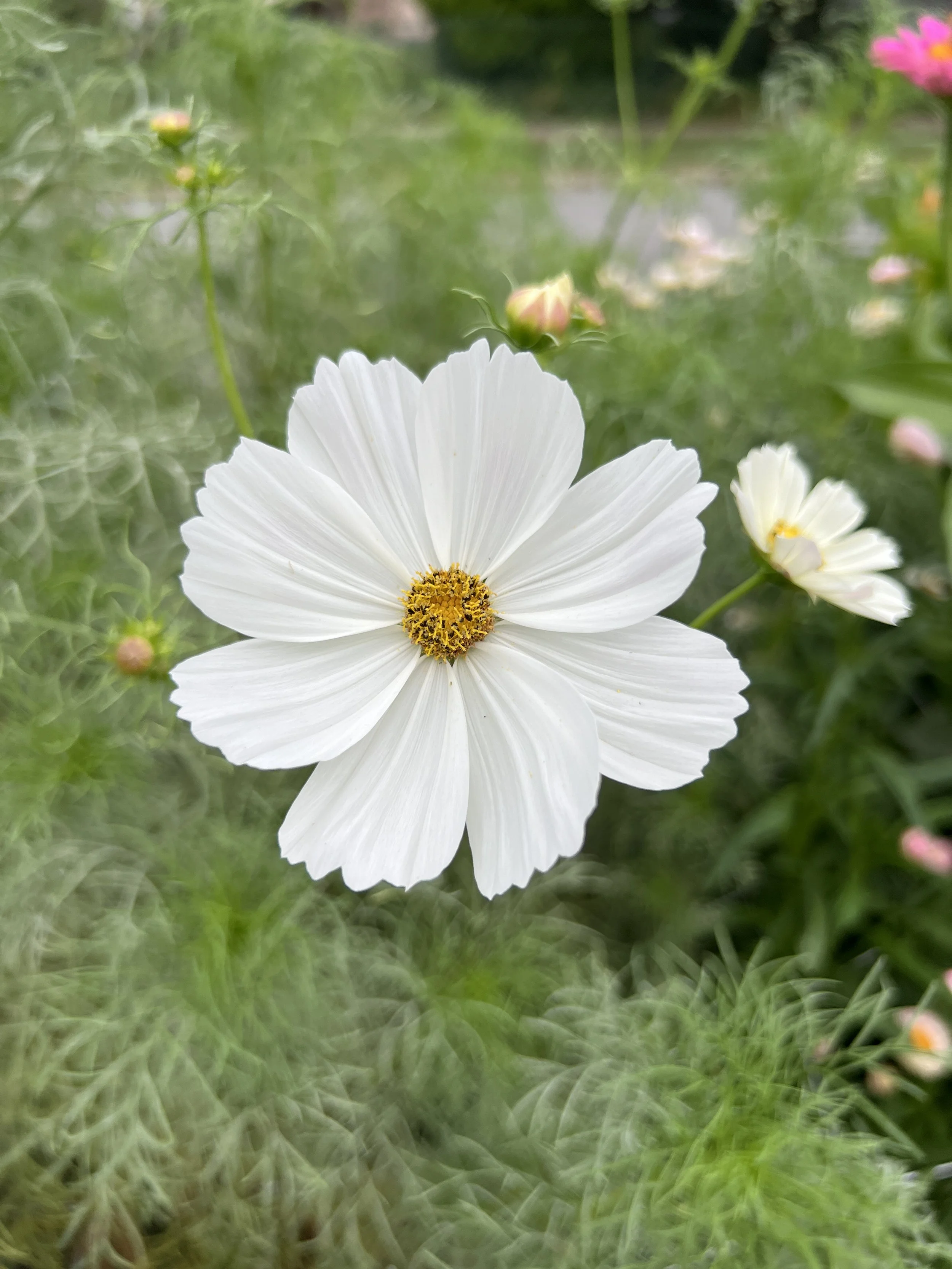 Cosmos have fluttery thin petals with vibrant round yellow centers and delicate lacy leaves. They grow, sometimes very tall, on Dr. Seussian stalks with many arms and sway in the breeze.
